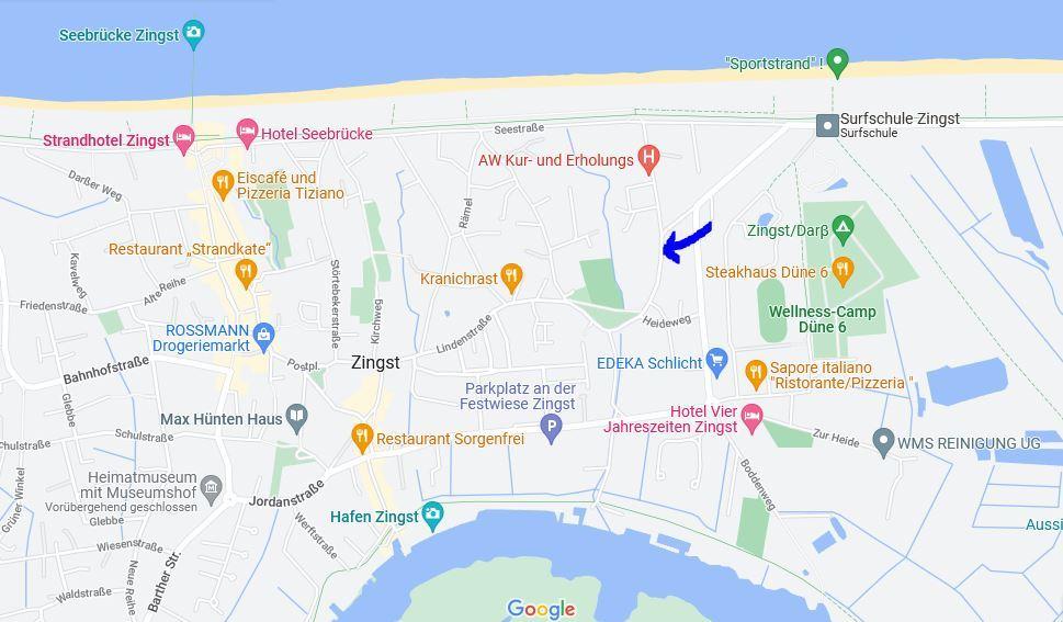 Von Bahnhof Barth mit dem VVR-Bus 210 nach Zingst (Haltestelle Hägerende oder Zingst Zentrum) oder alternativ mit dem Taxi bis Zingst (Birkenstraße 14a).